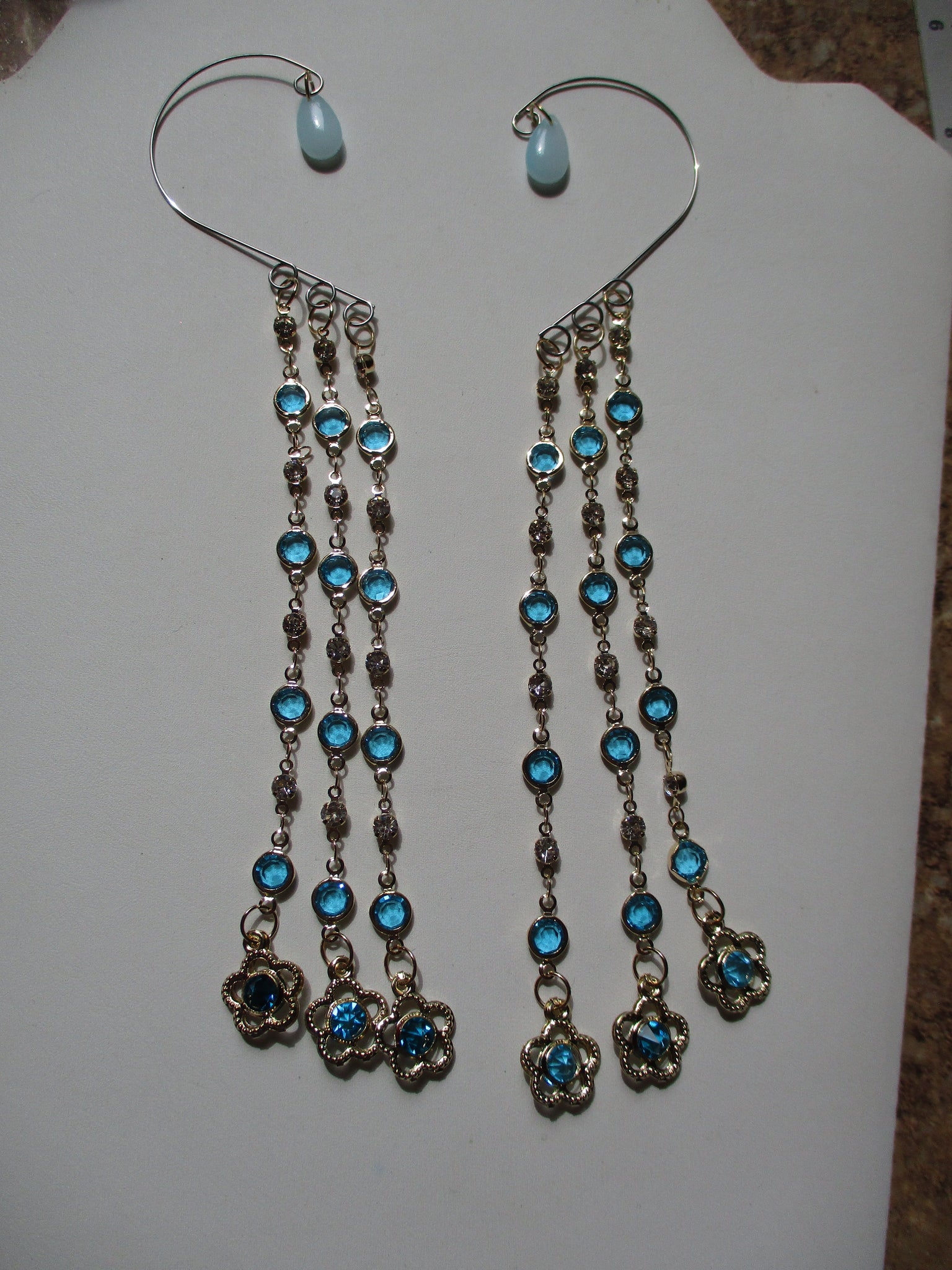 Silver Ear Cuffs with Gold Blue Bead Chain Gold Blue Flowers Blue Glass Tear drops (EC167)